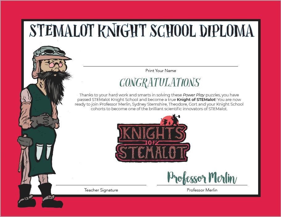 Knight of STEMalot diploma (one diploma placed in the large lock box, with individual diplomas distributed to all students after the game)