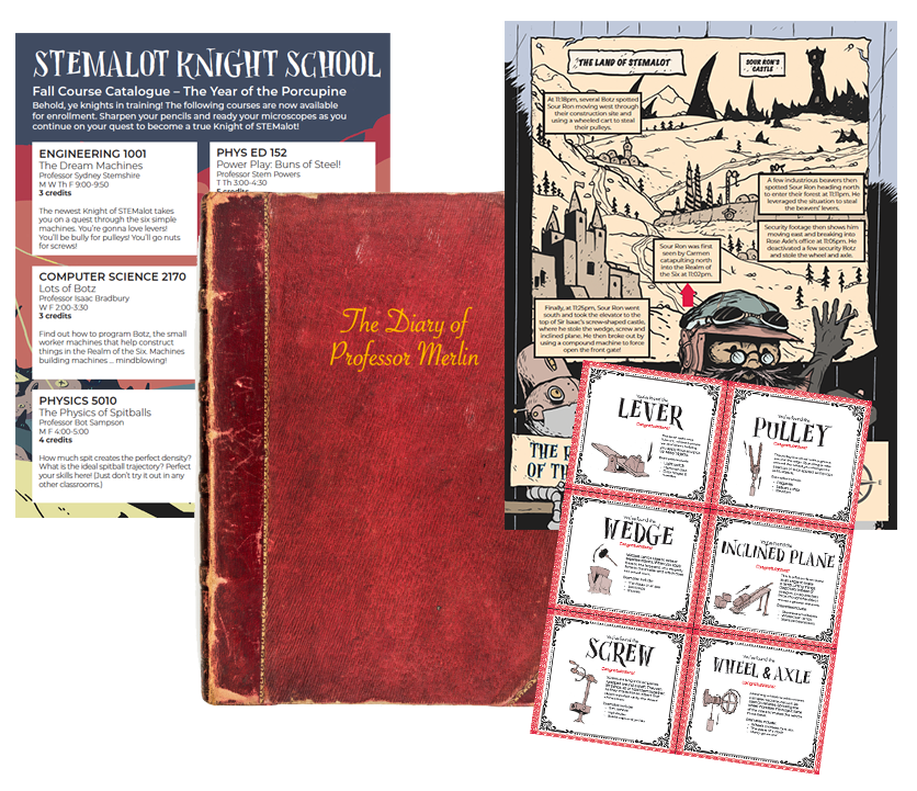 Listed below are the materials you need for your students to play the game. There are additional kit items provided to be used with future games but you’ll only need the specific kit items listed below for The Knights of STEMalot Power Play game. There are also suggested locations for some of the game materials. You know your students best, so feel free to get creative, making the gameplay tougher or easier by hiding clues and materials