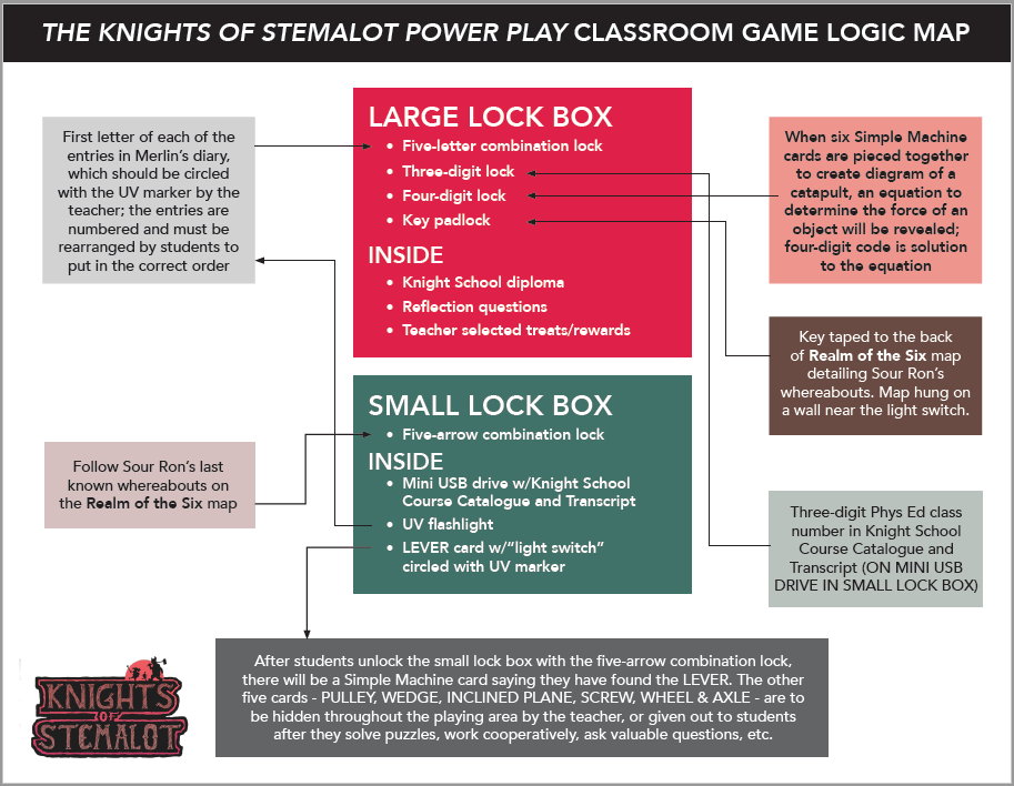 The following is a basic logical order for setting up The Knights of STEMalot Power Play game. If you are already familiar with Breakout-type games, this may be a breeze. If not, take it step by step. Setup should take roughly 30 minutes.